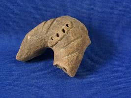 | Description / विवरण | Fragment of hind portion of an animal, both legs are broken. Applique design with pierced hole indicating the tail and two incised slanting lines on the tooth side and on the back portion. |