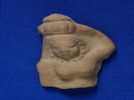 | Description / विवरण | Fragment of female figurine. Below waist is missing. She has carrying a Ghata or water-pot on her head.Neek is decorated by circular beaded design. Nose ring is also showing. |