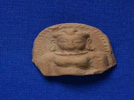 | Description / विवरण | Fragment of standing female figurine below waist is missing. She has showing two combed masses of hair on the sides and a top-knot with a plaited band pendent in the middle. Back plaque is of circular beaded shape round the head. A pearl-necklace and large oval ring are worn. Well baked to red colour. |