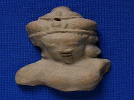 | Description / विवरण | Bust of a female figurine, showing trefoil coiffure with two roundish side masses of hair and a crest-jewel in the middle. A top-knot at the back with a suspension-hole. Her right ear lobe-cloven and in the left ear a conspicuous wheel-shaped pendant is worn. |