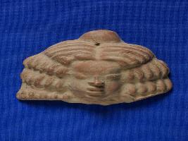 | Description / विवरण | Human head figurine, covered with locks of hair radiating from the middle parting as simulating from a parasol. Left ear lobe-cloven. Top-knot with hole completely preserved. |