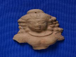 | Description / विवरण | Bust of female with a crest-jewel bearing the central parting, on sides the crisped curls falling in three parallel rows. A suspension hole in the top-knot. In the left ear wearing a disc-ring, the right ear ornament not distinct. Wearing a necklace. |
