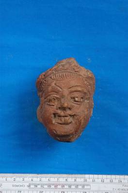 | Description / विवरण | Terracotta head. The hair are arranged above the head and form a raised border above forehead. Nose and eyes injured. |