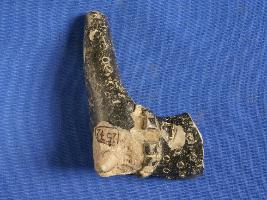 | Description / विवरण | Fragment of front portion of animal figurine. Front left leg is broken. Surface is similar NBP ware. Punch circular design over surface. Head and back portion is missing. Applique cut design on the body. Probably fragment of elephant figurine. |