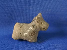 | Description / विवरण | A figurine of a dog, small open cut slit mouth is visible. The eyes of the dog is represented by circlet incised design and ears shown by up raised projection. Legs are broken. Blackish colour. |