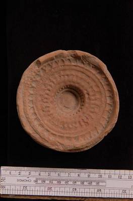 | Description / विवरण | Terracotta mould of a wheel with a knob in the center and lotus petals and buds around it. |