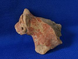 | Description / विवरण | Fragment of front portion of an animal possibly bull or cow . Legs are missing and mouth is broken. The eyes are shown by applique circular with hole upon applique band. The applique design with holes on the forehead. well baked to red slipped |