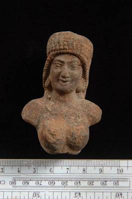 | Description / विवरण | Female bust. Hands gone. She wears a headdress studded with beads. |