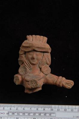 | Description / विवरण | Bust of a female figure with hair supported by a band of thick pagree stamped with leaf designs. It wears applied decorated tops and neck ornaments. The decorated pendent of the necklace is stuck above the breast. Right hand lost. |