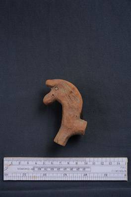 | Description / विवरण | Terracotta head of an animal with a hole on the mouth. Eyes incised in circular fashion. Long incised lines are seen on the neck. |