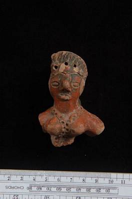 | Description / विवरण | Bust of a female figure with three holes above the forehead. It has a thick nose and incised eyes. It wears an applied chain hanging below passing through the breast. Ear and hands lost. Hair shown with standing incised lines. Painted brown. |