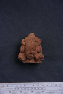| Description / विवरण | Terracotta head with hair parted in the middle and arranged falling on sides. The locks of hair on its right side lost. Right cheek cut off. Left eye along with cheek damaged. |