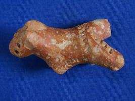 | Description / विवरण | Fragment of cow figurine from head to hind. Front legs are broken. Back right leg, tail and back portion of forehead are slightly broken. Eyes are shown by circular applique incised design. Waist is decorated by punching holes. Nostril is shown by transverse hole. Handmade and red colour. |