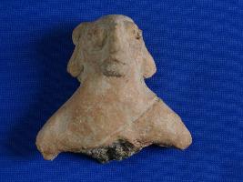 | Description / विवरण | Bust of human figurine, from head to chest. Goat like ears. Nose is shown by pinching method. Eyes have pierced holes. Right eye and mouth is damaged. Slanting line on the body. Handmade and dull red colour. |