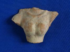 | Description / विवरण | Fragment of female from neck to below chest. Arms missing, showing well rou ended breasts. She wears a neck lace. Traces white paint. Well baked to red colour. |