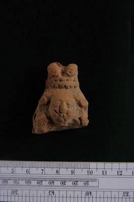 | Description / विवरण | Small head with hair arranged upwards in two rolls tied with twisted strings and decorated with two rosettes. Chin and mouth injured. |