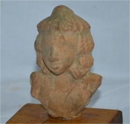 Terracotta bust of a female figure. The tresses of the hair are arranged in the form of a cup over the head and are also hanging over the shoulders.