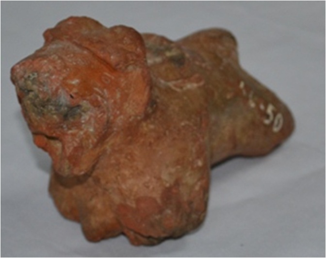 Terracotta fragment showing a tiger. Its mouth is open perhaps it was depicted in the roaring condition. At its back there are ramnent of clay mark. Most probably some god or goddess was riding over it.