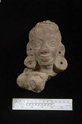 | Description / विवरण | Terracotta head of a female figure with right breast. Hair arranged in the form of jata at back side. There are a vertical and horizontal applied pillets stuck at the headgear. She wears round earring with a hole in the center. Left shoulder with breast lost. Eyes, forehead and nose injured. |