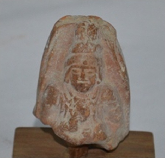 Terracotta piece showing a devotee . Only the bust part is shown as it is mutilated below the chest. Its colour is pinkish brown.