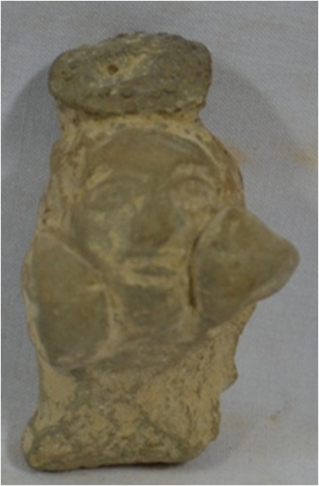 It shows the head of a female figure. The ear-rings are thick and large and are touching the cheeks of the woman.The back of the head and the neck are somewhat flat. The colour is grey.