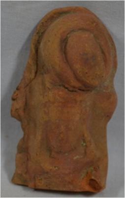 Terracotta piece showing a human face and above the head two abstract forms, a ring like form and an oval form placed in it. The colour is pinkish brown.