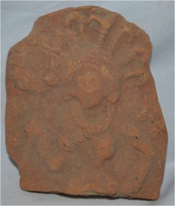 Terracotta showing a deity holding a lotus in her right hand & the left hand is placed at the waist. She is wearing a crown, necklace, armlets & bracelets.