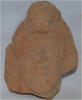 Showing male head. On the top of the head hairs are gathered in a bun. Mouth is bit open.