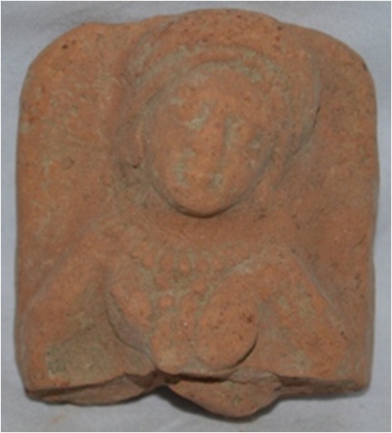 Terracotta showing bust of a woman. She wears a prominent necklace. At the center of the broad also, some part of necklace is shown turban type headdress is shown over the head. Back is plain.