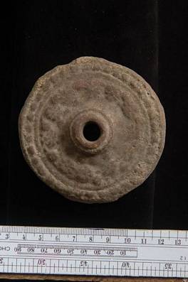 | Description / विवरण | Wheel of a toy cart having a hole in the center. It preserved a line of dots and of rosettes around it. |