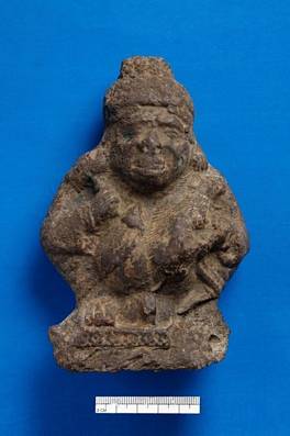 | Description / विवरण | Terracotta figure of a seated yaksha. Holding a bird or an animal in heir hands. His face has terrific expressions. Hair arranged in the shape of a pagree and divided in to four rows. Face badly damaged. Left part of the base gone. |
