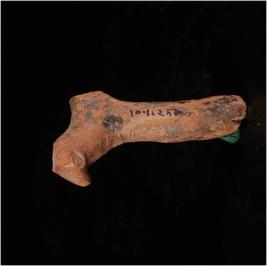 | Description / विवरण | Head portion of a handmade terracotta animal figurine with elongated neck, broken horns and snout, surface treated with a slip in dark red colour and incised design on the neck. |