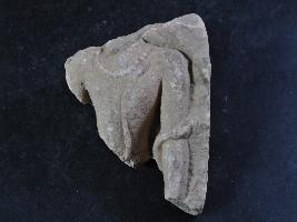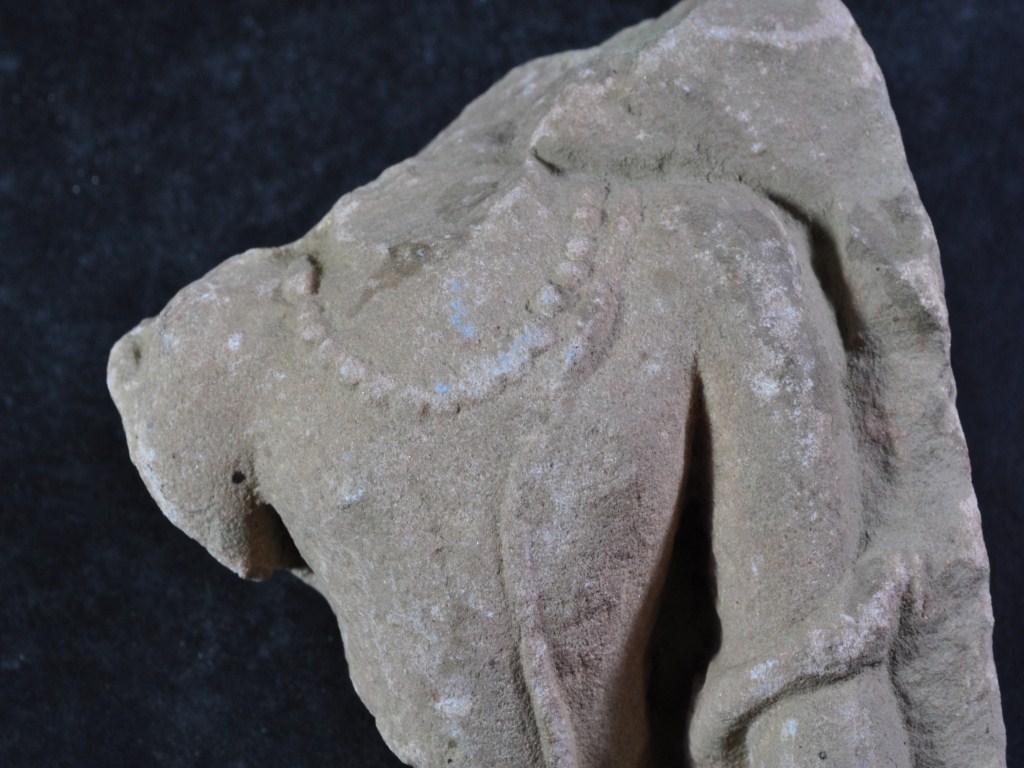 It s a stone sculpture. It is damaged from all sides and its colour is brownish. It is well decorated and human figurine on it. Its neck is lost and hands are broken. It is wearing necklace and bottom portion is lost. Many irregular marks on the surface. Rubbing on the surface and deposition of dust. Surface is rough and flaking on it.