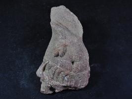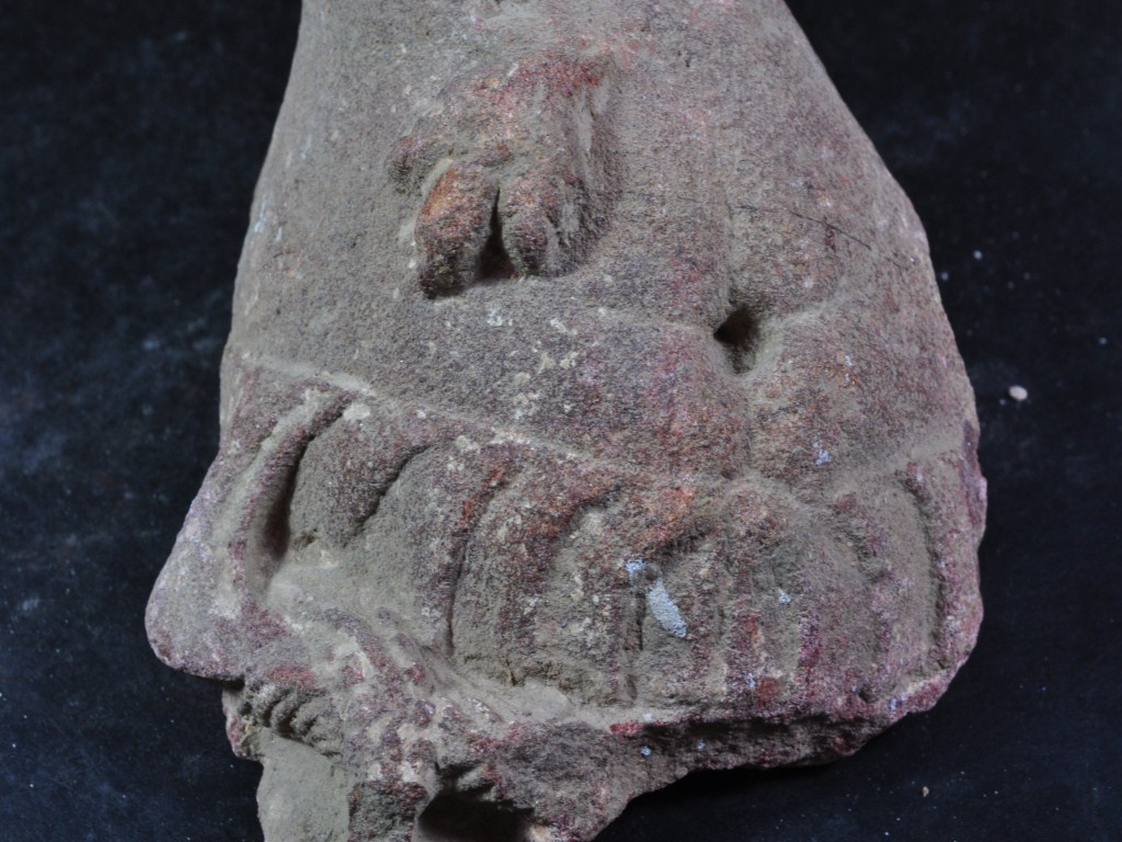 It s a stone sculpture. It is damaged from all sides and its colour is brownish. It is well decorated and male figurine on it. Its neck and hands are lost. Its bottom and back portion is lost. Many irregular marks on the surface. Rubbing on the surface and deposition of dust. Surface is rough and flaking on it.