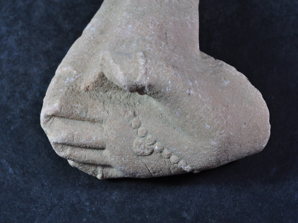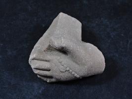 It s a deity hand made of stone, Colour is brownish. It s only one hand is presenting and wearing holythread. It s all sides are broken. Deposition of dust and dirt. Rubbing on the surface and flaking on it.