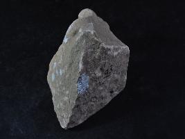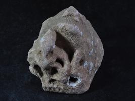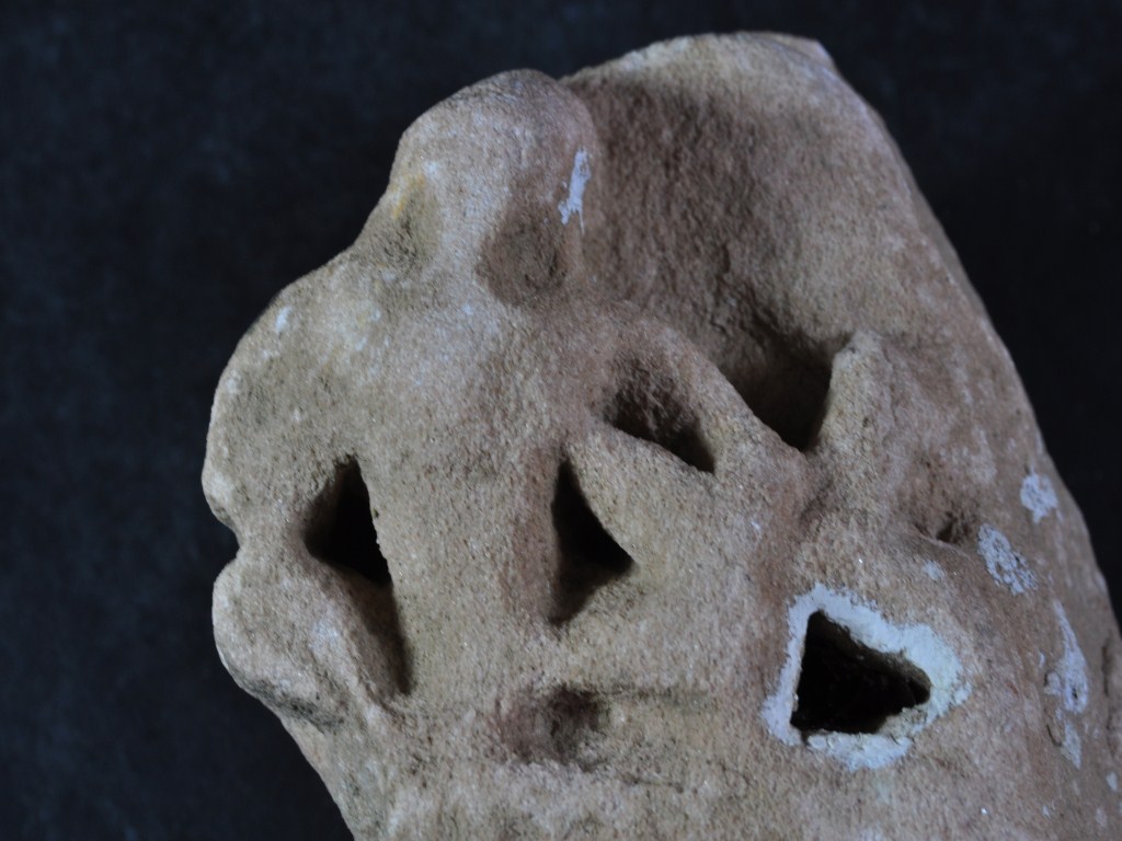It s a human figurine made of stone, Colour is brownish. It is holding something in the left hand and sitting positing. The image has been badly mutilated and side is broken. Deposition of dust and dirt. Rubbing on the surface and flaking on it.