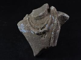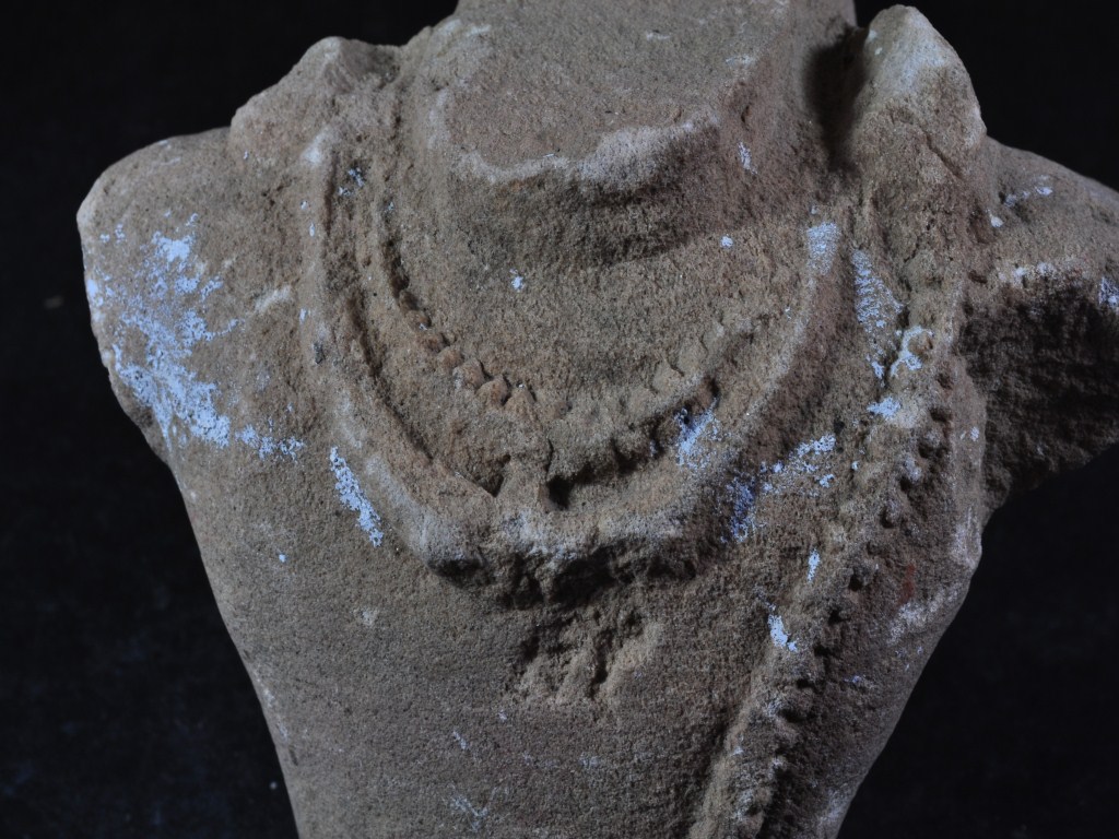 It s a deity figurine made of stone, Colour is brownish. It is wearing garland, necklace, jaineu and neck and bottom portion is broken. Deposition of dust and dirt. Rubbing on the surface and flaking on it.