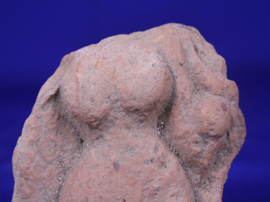 It is a figurine of female without head and feet. Prominent breasts are visible. There is no ornamentation is visible on her body.