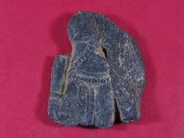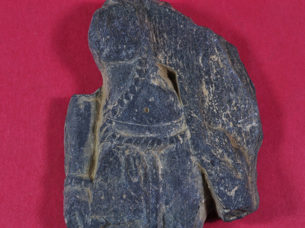 It s a human figurine made of stone, Colour is black. It is wearing garland, belt, bracelet and standing position. It s neck and bottom portion are broken. Deposition of dust and dirt. Rubbing on the surface and flaking on it.