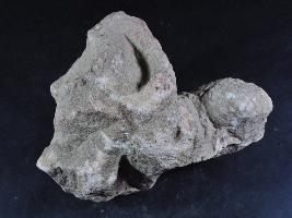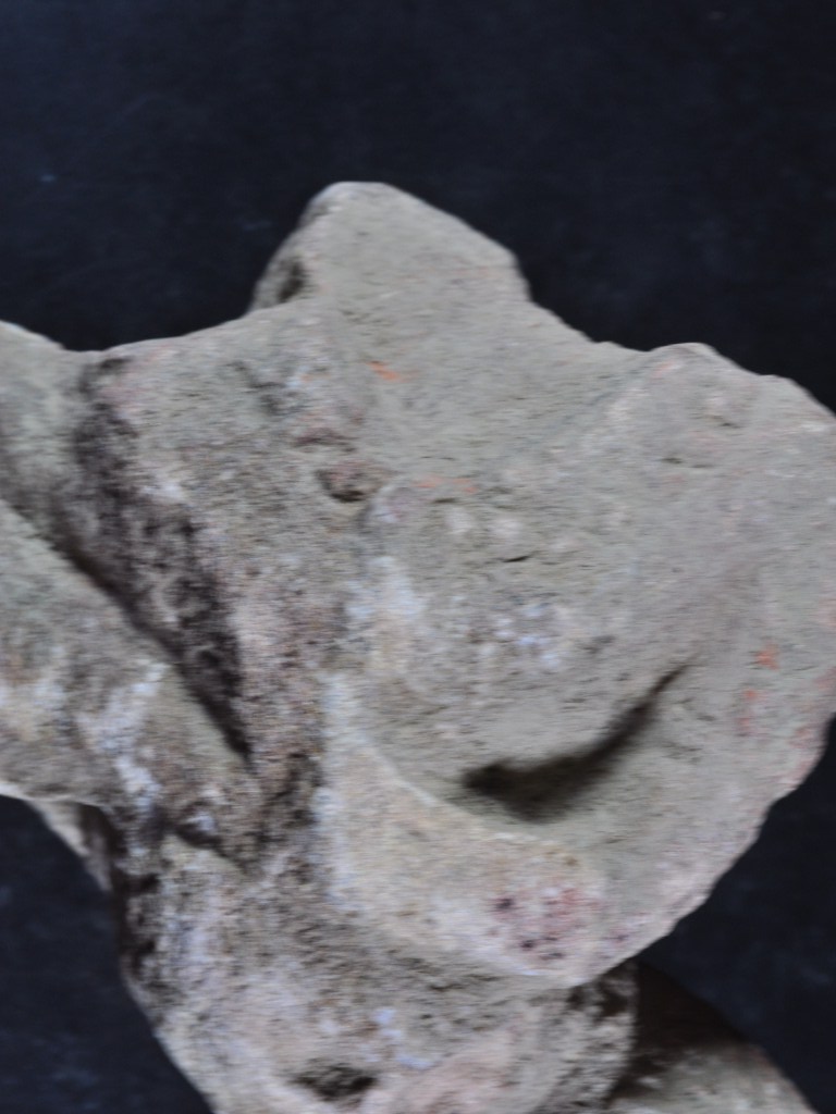 It s a human figurine made of stone, Colour is brownish. It is wearing beaded garland and armlet. It is badly damaged. Rubbing on the surface and flaking on it.