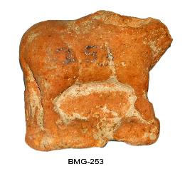 | Description / विवरण | Broken bull figurine standing on a pedestal in static position. It wears series of bells all around its neck. It shows a robust body, hump broken and stout legs. Head is broken and missing. |