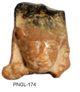 | Description / विवरण | Head of human figure with large ornamental devices on either side faintly seen on one side and a prominent crest jewel hanging down on the forehead faintly seen , suspended from the tied up hair Upasa . Her hair is combed neatly and drawn backwards and plaited into a tail. She wears patrakundalas. |