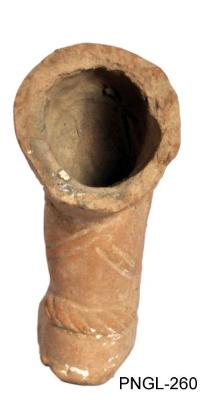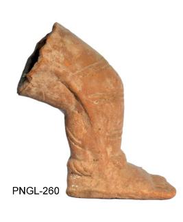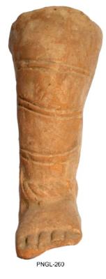 | Description / विवरण | Broken leg is decorated with an anklet. It is made of double mould. The lower part of drapery on the leg is tied with circular bands right from knee to the ankle. |