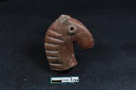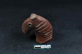 | Description / विवरण | A fragment of head of an animal figurine identified as Horse having broken ears, projected mouth, applique pinhole eyes, deep incised line marks on back and rough surface. |