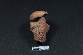 | Description / विवरण | A fragment of human head having broken nose, incised circular eyes, bog circular appliue ears, tilted hat on head and rough surface. |