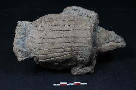 | Description / विवरण | Fragmentary head of human figurine with prominent headdress with vertical incised lines and facial features having rough surface. |
