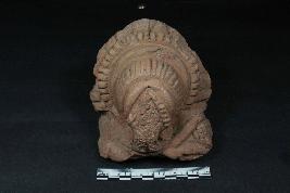 | Description / विवरण | Fragmentary head of Human figurine with obliterated face and decorated head gear marked by series of circular grooves and linear incisions having rough surface. |