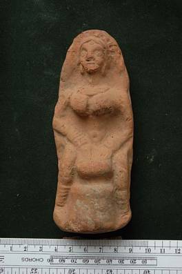 | Description / विवरण | Terracotta plaque detesting a seated female figure probably playing on drum. She wears an ornamented necklace and pagers feet shown with full of kara. She is facing front eyes chin and breast damaged. |