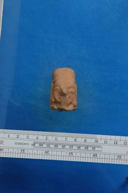 | Description / विवरण | Terracotta head having a prominent nose, a band of cloth tied on the head hangs on the back side. Mouth injured. |