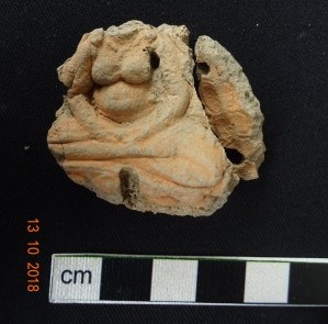 clay image of miniature Buddhist deity. Head portion is missing. It has big bosom and pot belly, sitting in Padmasana position.